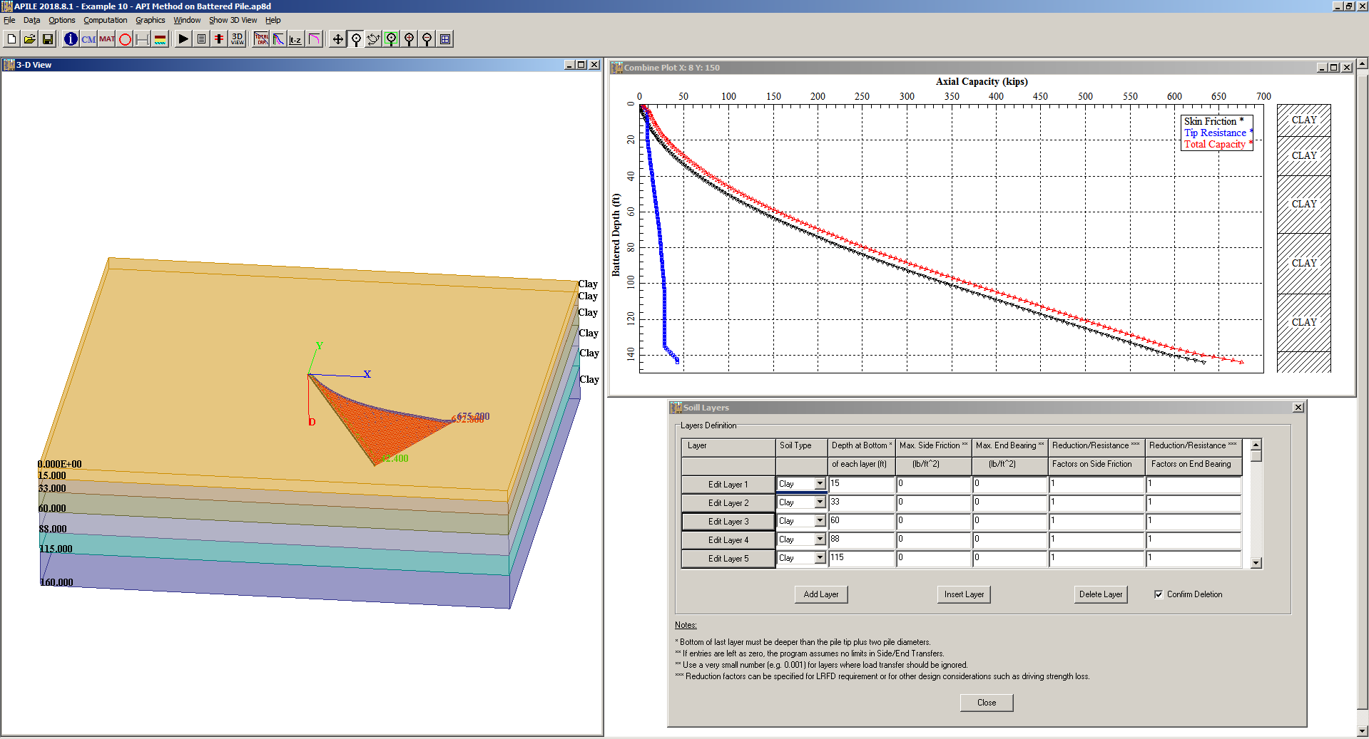 APILE is used to compute the axial capacity, as a function of depth, of a driven pile in clay, sand, or mixed-soil profiles.