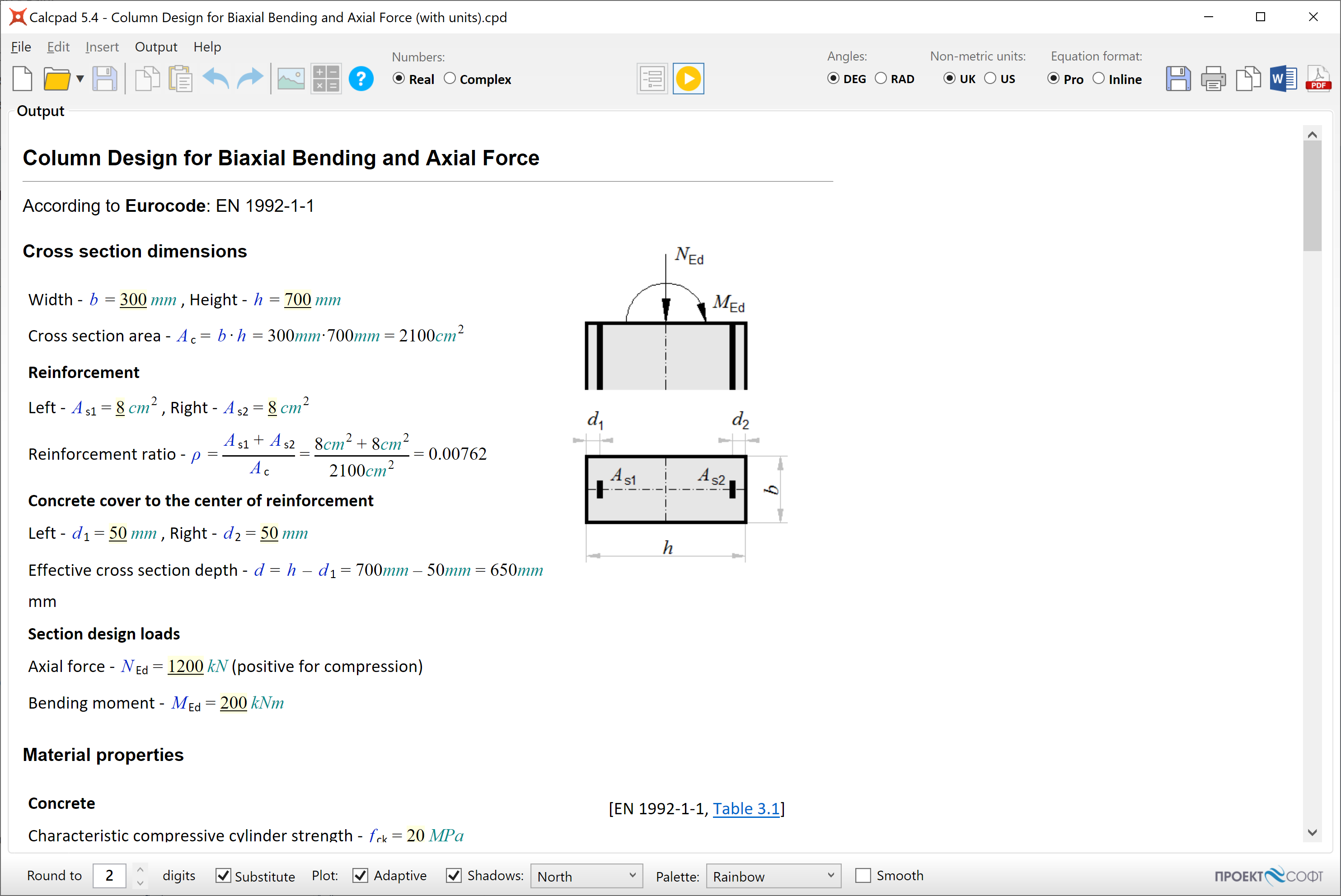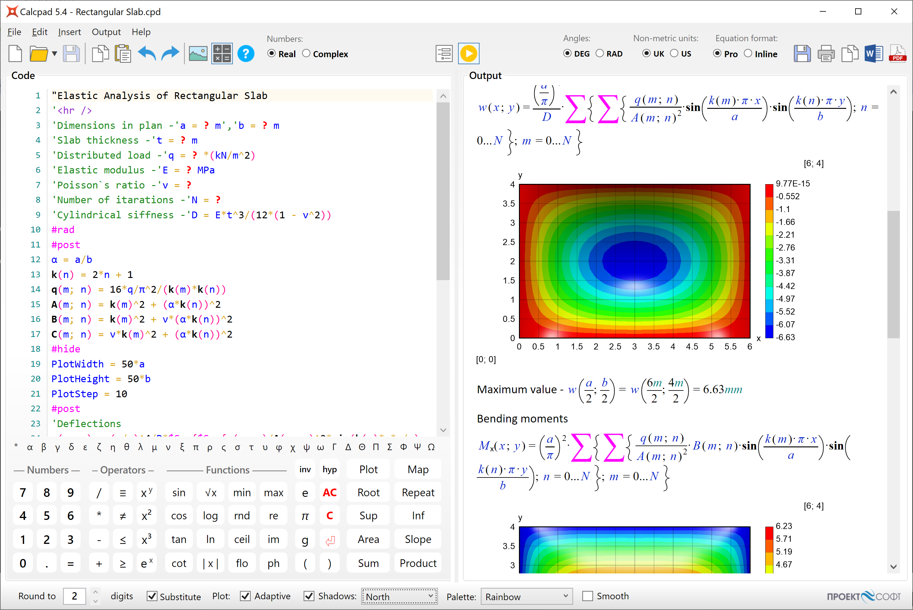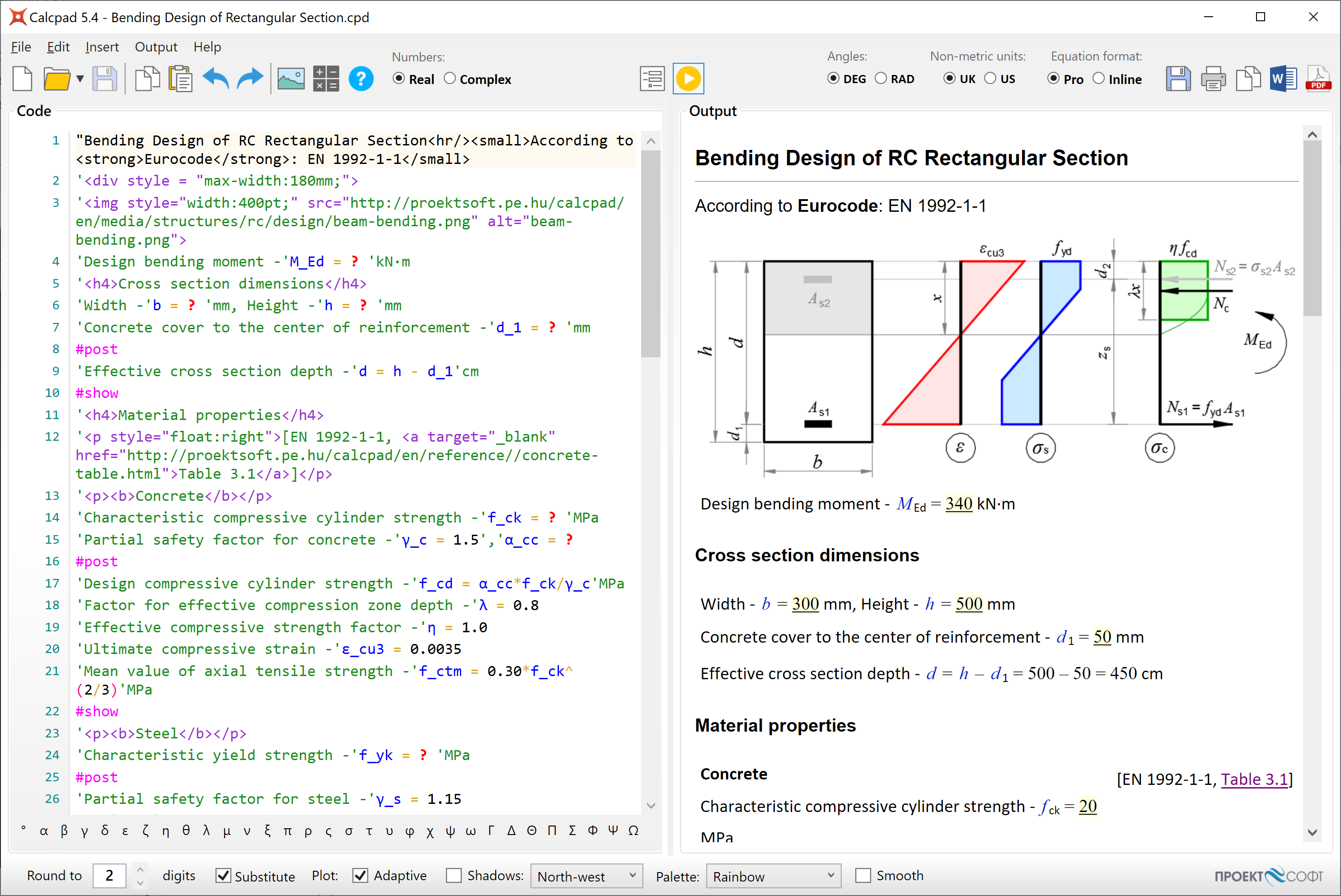 Calcpad supports real and complex numbers, physical units, variables, functions of multiple arguments, graphing and numerical methods. Some advanced features are also available: conditions (#if, #else, #end if), cycles (#repeat, #loop), output visibility control (#hide, #show), content folding, smart rounding, smart brackets, etc. You can add 'comments' and "titles" in quotes. Besides simple text, you also can also include Html, CSS, SVG and JS. Use them to add images, tables and rich formatting to your calculation notes. You can also generate beautiful Html input forms and protect your source code. Just put "?" wherever you want to enter values. Calcpad is not just for for doing calculations. You can also produce professionally looking engineering documentation. All results are automatically formatted as Html reports can be thoroughly checked. That makes Calcpad a perfect solution for development of engineering workheets.