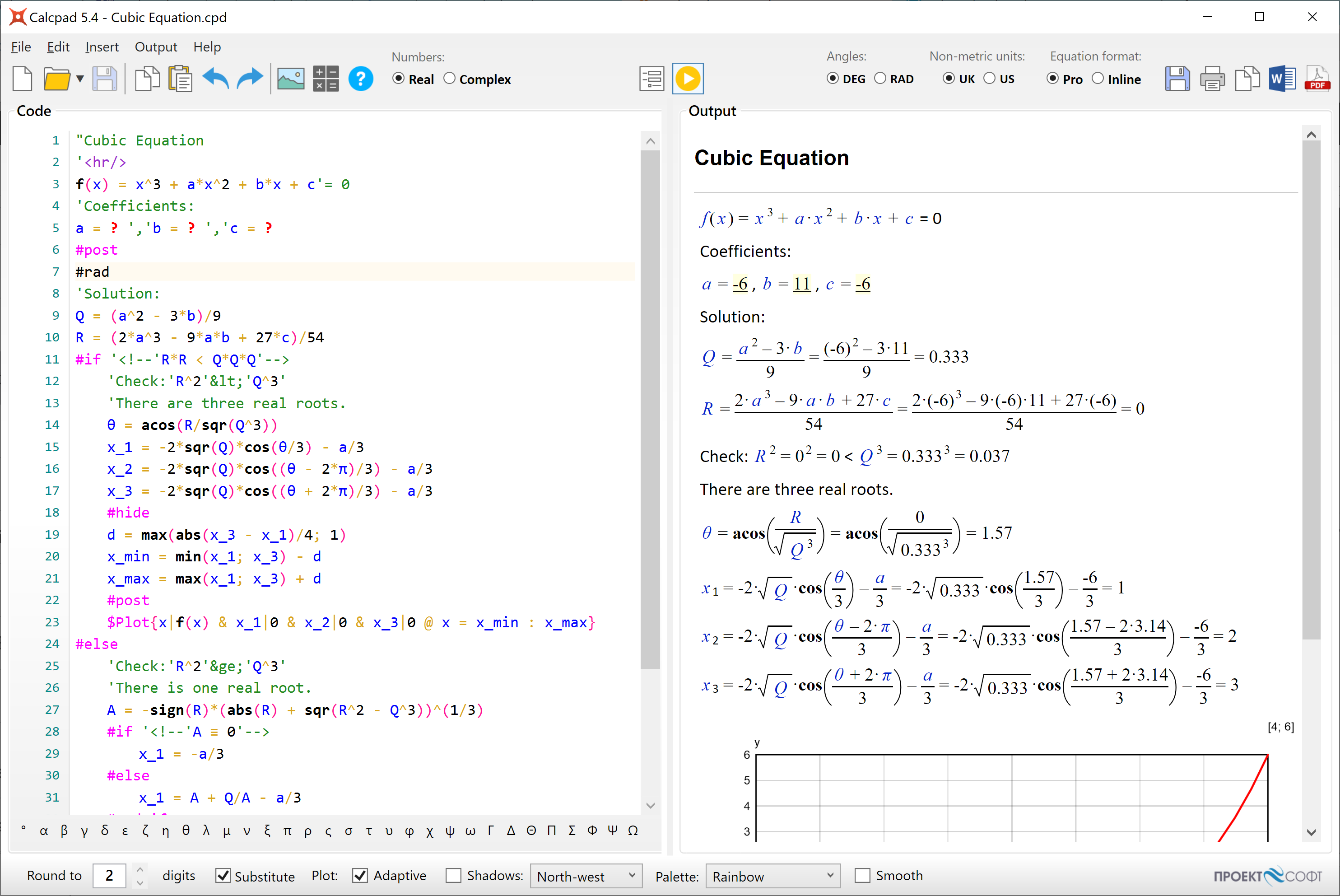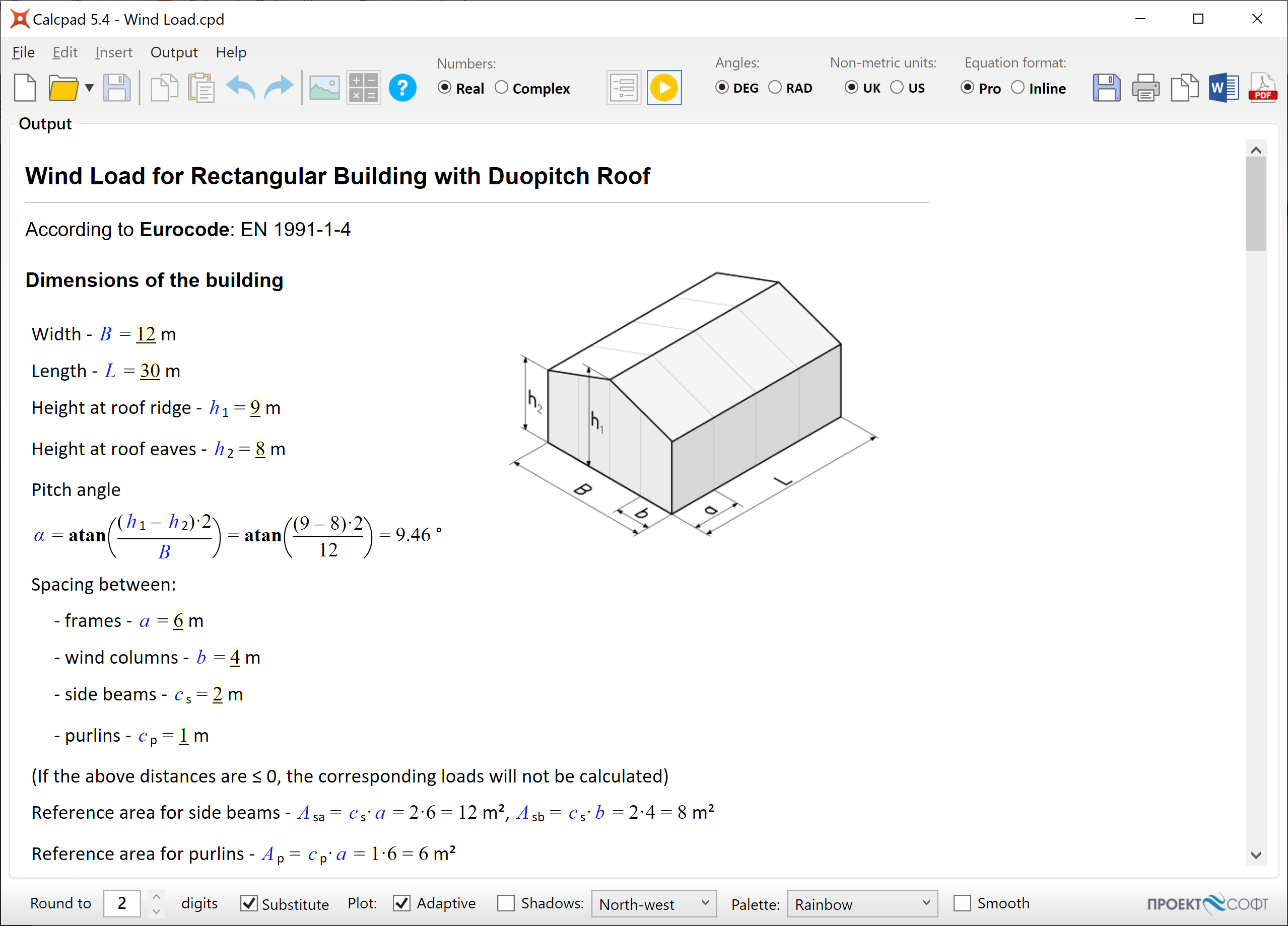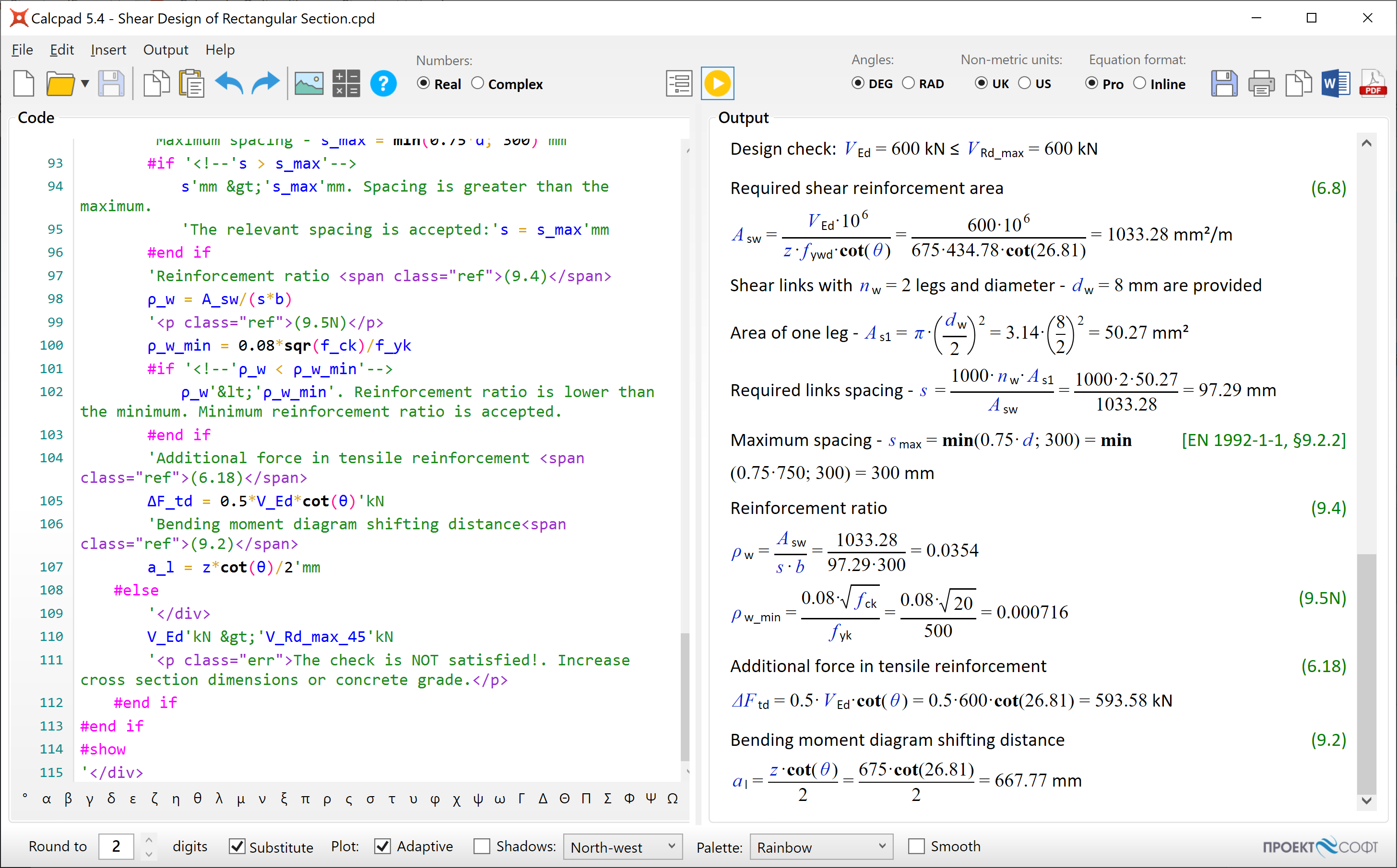 Calcpad supports real and complex numbers, physical units, variables, functions of multiple arguments, graphing and numerical methods. Some advanced features are also available: conditions (#if, #else, #end if), cycles (#repeat, #loop), output visibility control (#hide, #show), content folding, smart rounding, smart brackets, etc. You can add 'comments' and "titles" in quotes. Besides simple text, you also can also include Html, CSS, SVG and JS. Use them to add images, tables and rich formatting to your calculation notes. You can also generate beautiful Html input forms and protect your source code. Just put "?" wherever you want to enter values. Calcpad is not just for for doing calculations. You can also produce professionally looking engineering documentation. All results are automatically formatted as Html reports can be thoroughly checked. That makes Calcpad a perfect solution for development of engineering workheets.