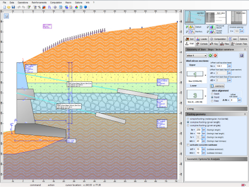 The wall can be characterized by the presence of piles, micropiles, tiebacks (active and passive); it can have any kind of geometry and it can also include a simple or a complex footing with variable thickness. User is free to assign or not assign an inclination to the foundation and to the wall surface (both inside and outside).