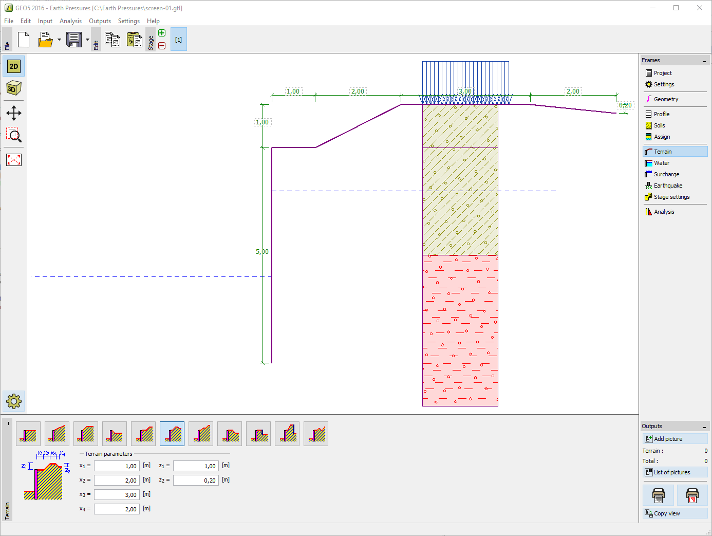 This program computes basic earth pressures (active pressure, passive pressure and pressure at rest) acting upon an arbitrary shaped structure. The main features of GEO5 Earth Pressure program are: