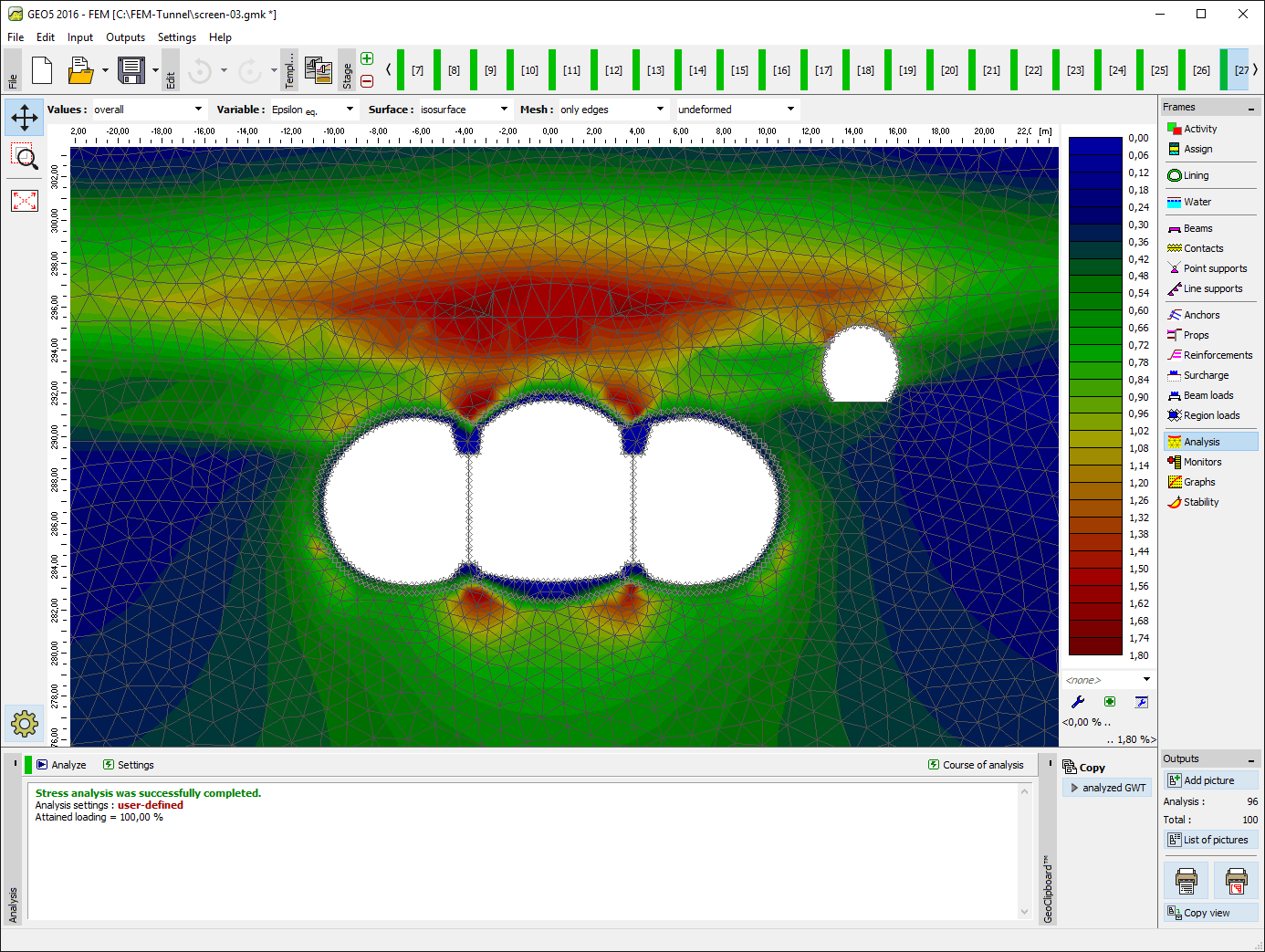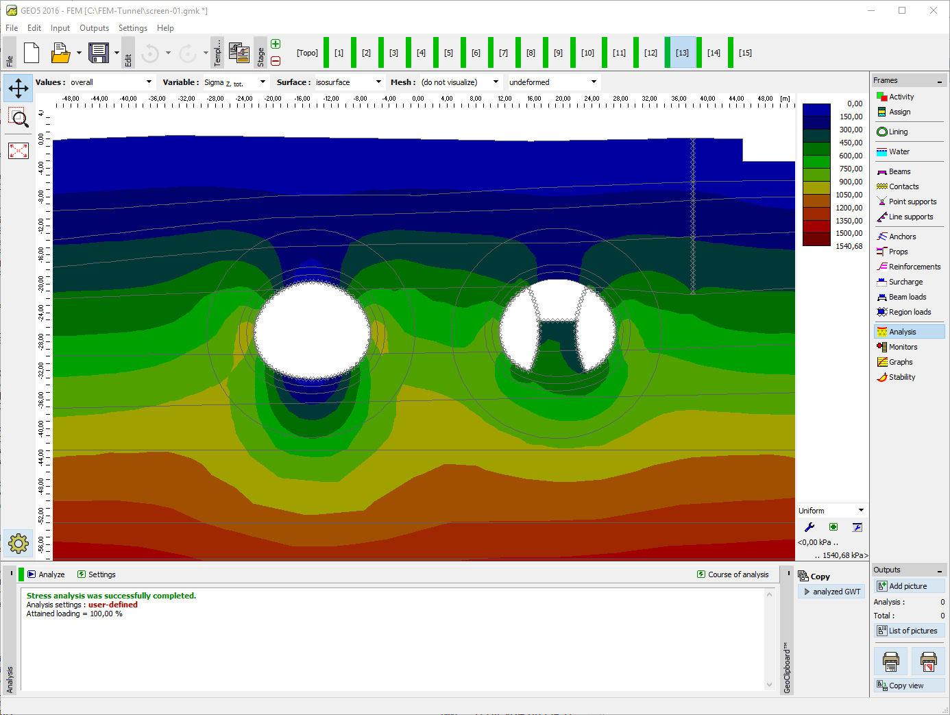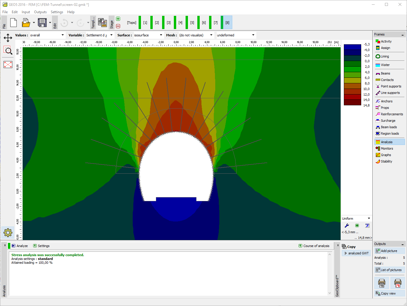 GEO5 FEM - Tunnel is used to design and analyze tunnels. It includes specialized tools for the definition of tunnel lining, the system of anchors and rock bolts and grouting-strengthen regions. The relaxation factor assigned to each construction stage takes the 3D effect of the excavation into account. The main features of GEO5 FEM - Tunnel module are: