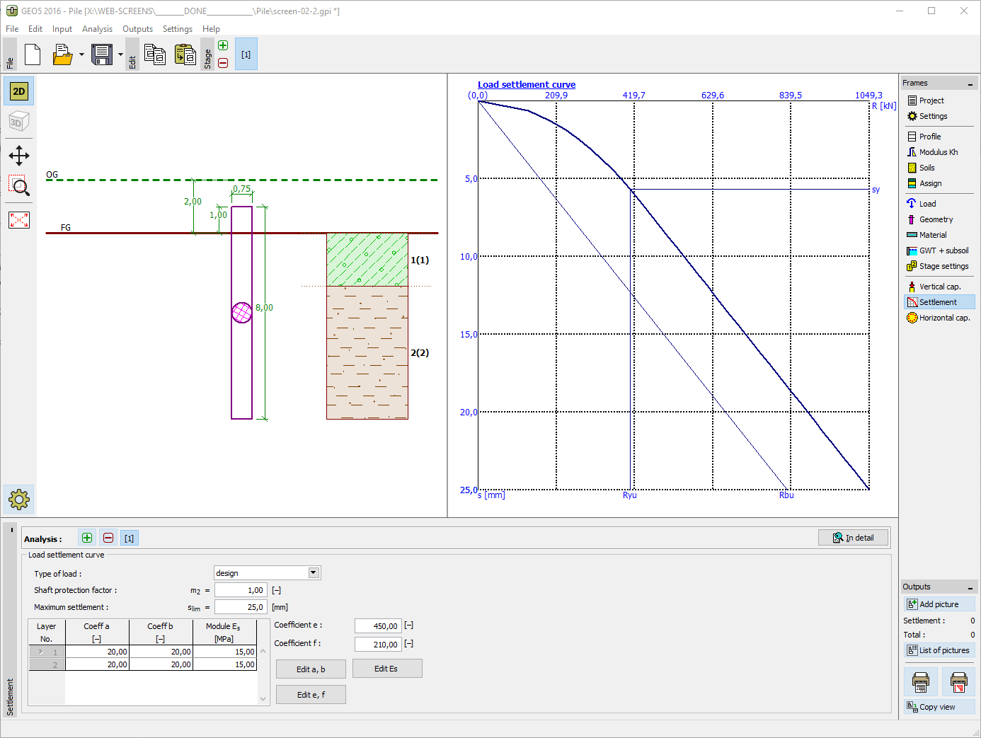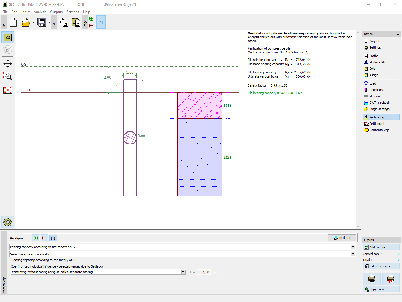 This program is used for the analysis of the vertical bearing capacity of a single pile loaded both in tension or compression, pile settlement, as well as horizontal bearing capacity of a single pile. The main features of GEO5 Pile program are: