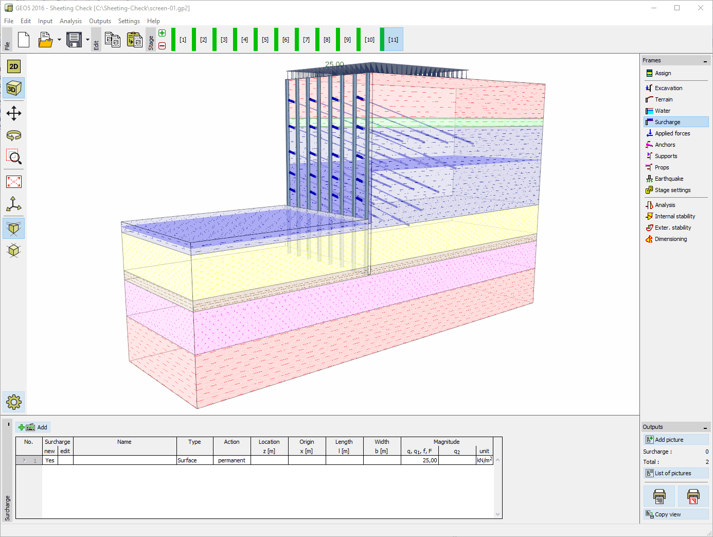 - Arbitrary number of surcharges applied to structures (strip, trapezoidal, concentrated load)
