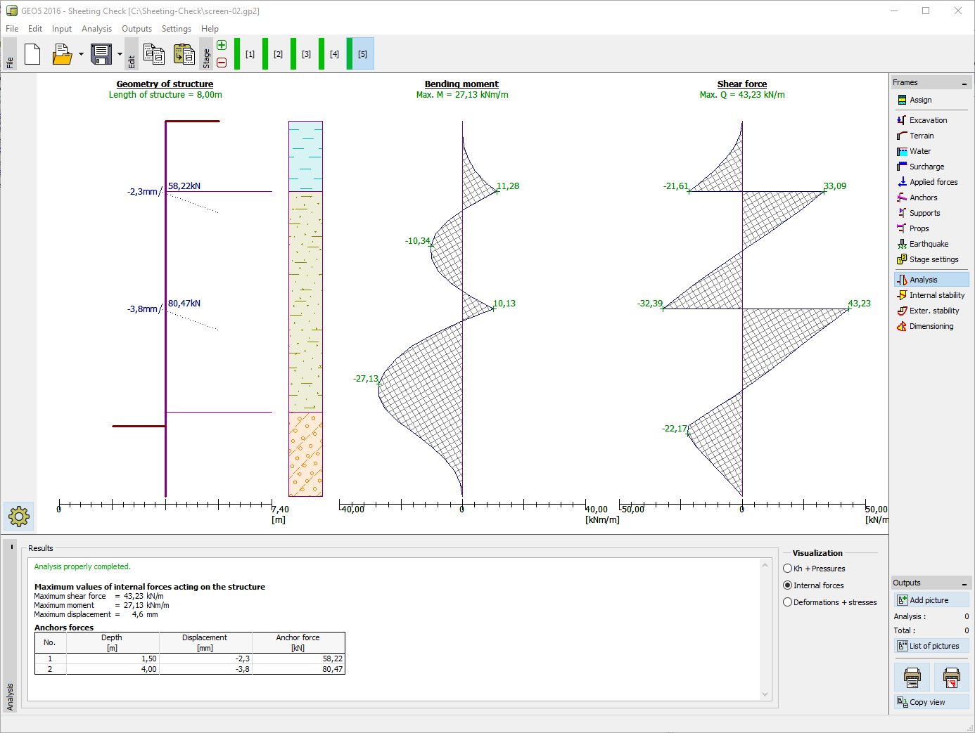 This program is used to make the advanced design of embedded retaining walls using the method of elastoplastic non-linear analysis. It allows the user to model the real structure behavior using stages of construction, to calculate the deformation and pressures acting upon the structure, to verify the internal anchor stability or to verify cross sections (steel, RC, timber) and the bearing capacity of the anchors. The main features of the GEO5 Sheeting Check are: