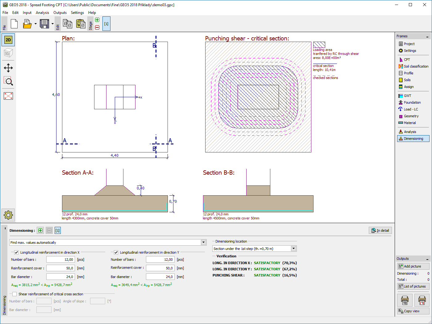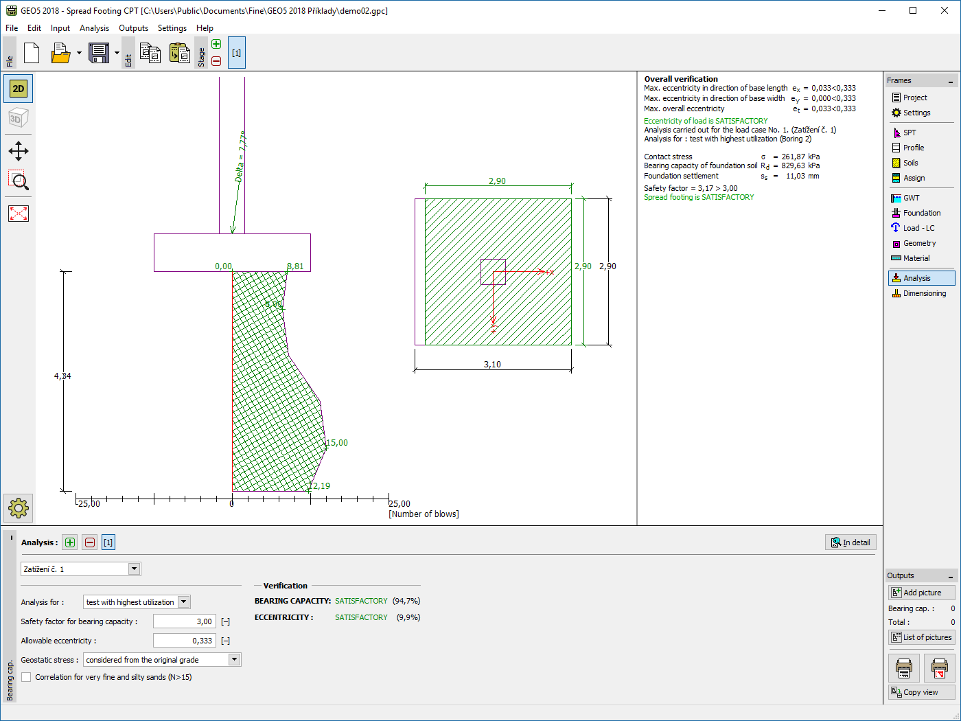 This program is used for the design and verification of spread footing foundations based on data from field tests (CPT, SPT). The program performs an analysis for vertical and horizontal bearing capacity, settlement and longitudinal and shear reinforcement (punching). The main features of GEO5 Spread Footing CTP program are: