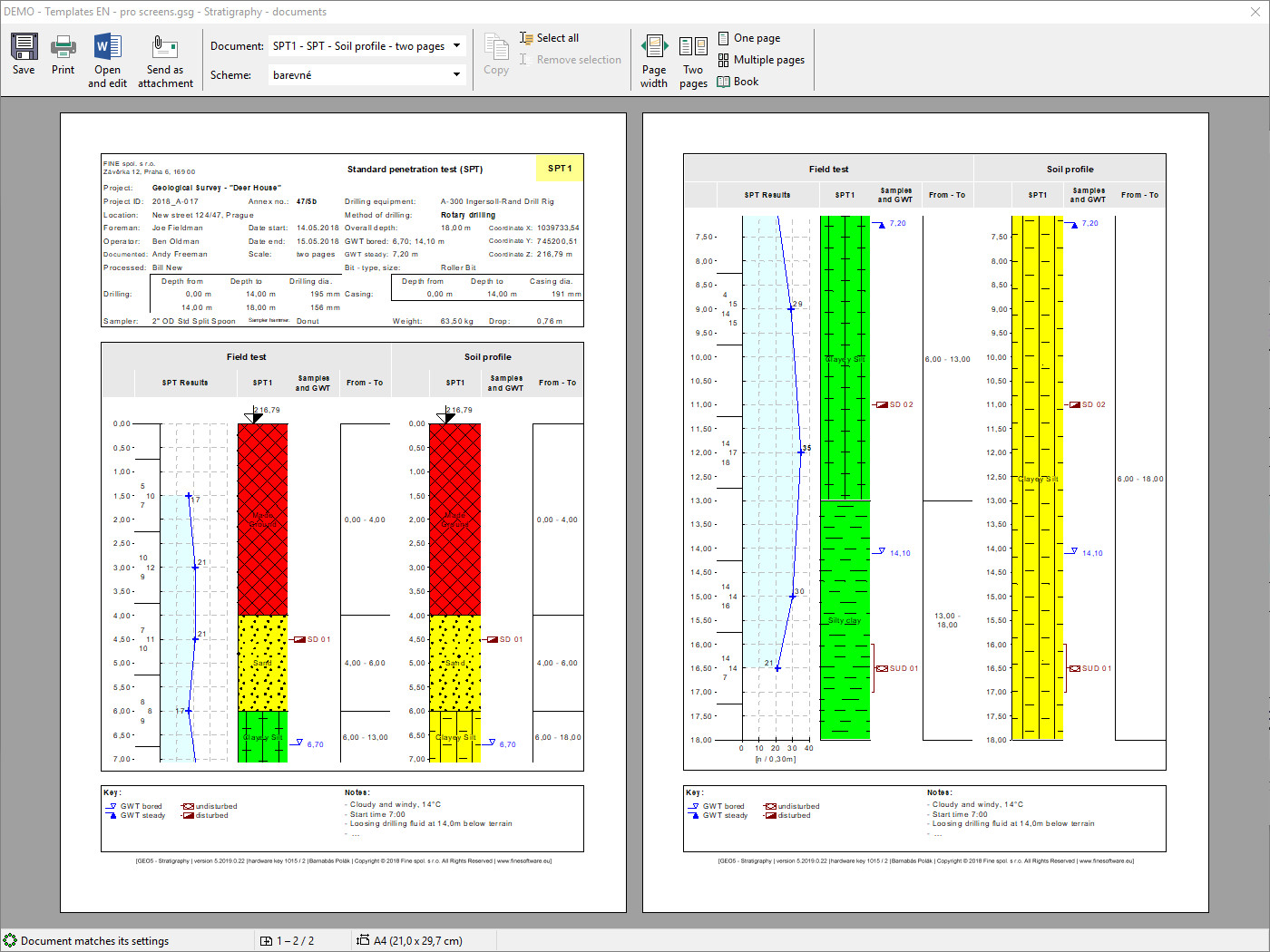 The Stratigraphy - Logs module is used for geological data reporting from site investigation (boreholes, wells, SPT, CPT, DMT and more). It provides a comprehensive database of pre-defined templates and the ability to create user-defined templates and data reports. To create cross sections use Stratigraphy - Cross Sections module, both modules are extensions of the Stratigraphy program. The main features of GEO5 Stratigraphy - Logs are: