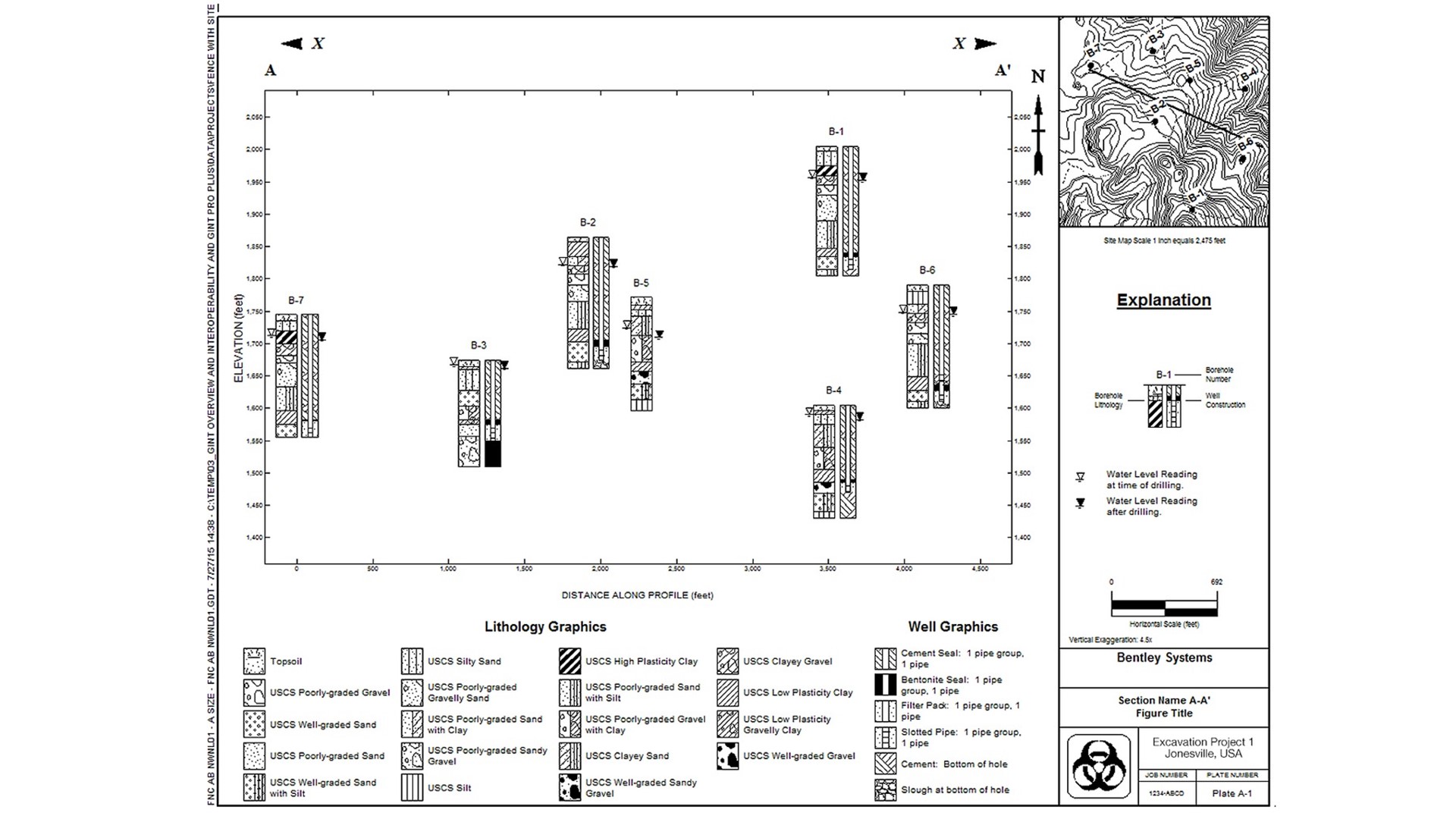 gINT supports the data interchange formats from the U.K.’s Association of Geotechnical and Geoenvironmental Specialists (AGS). To make working with AGS data easier, gINT provides a starting database and reports for AGS data; however, gINT’s flexibility allows users to modify their database while allowing full AGS compatibility via correspondence files. Users can import, export, and validate AGS data, as well as edit AGS data directly in Microsoft Excel. gINT AGS validation goes beyond simply detecting file errors. gINT finds conditions that could compromise data quality as well as unnecessary, redundant, or missing non-critical, descriptive data. Users can easily generate data statistics for their AGS files such as the number of records in each file, hole counts by type, total drilling length, and sample type.