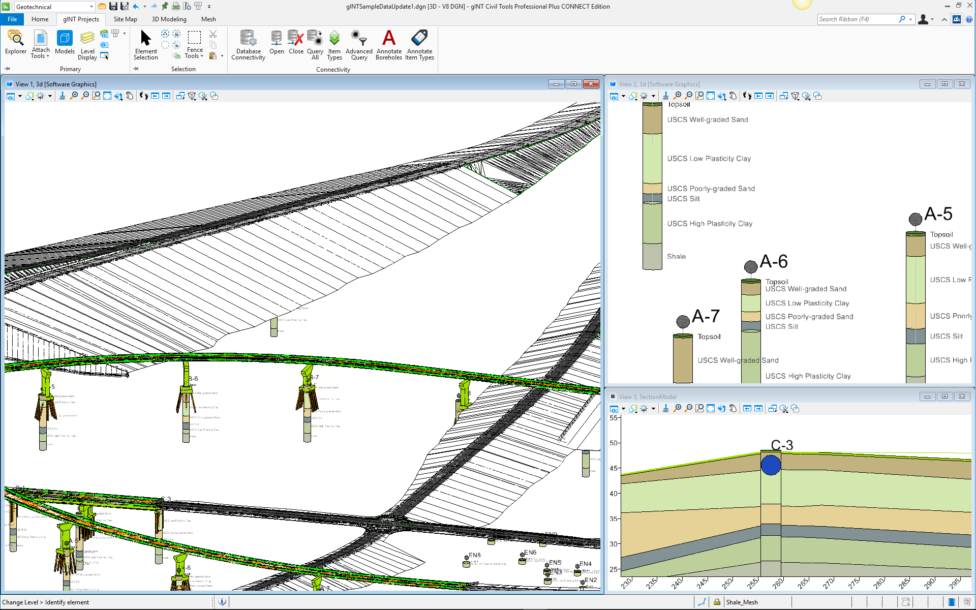 gINT Professional users have access to gINT Civil Tools, which provides capabilities for modeling and 3D analysis. Lithology contacts and water table surfaces can be created and modified. Boreholes and subsurface observations can be displayed using different formats to enhance analysis.