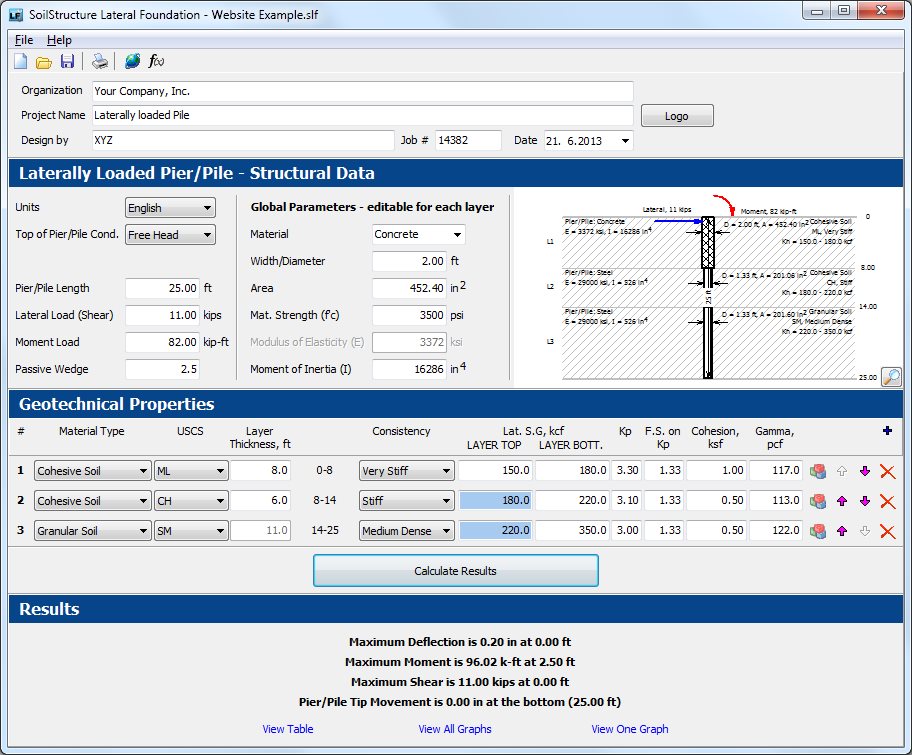 The site soils are often stratified, so Pile Design – Lateral can handle 2 to 10 soil layers. Analysis can be done in SI units or in English units. Supports Window XP/Vista/7/8 systems.