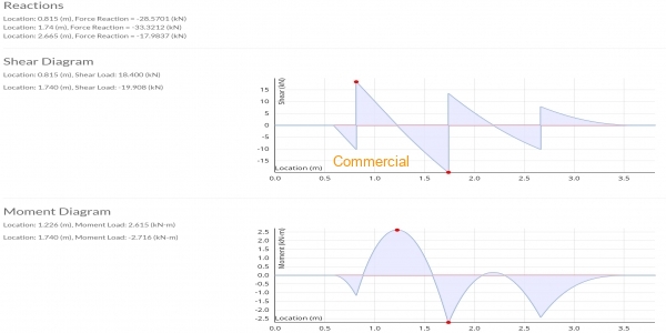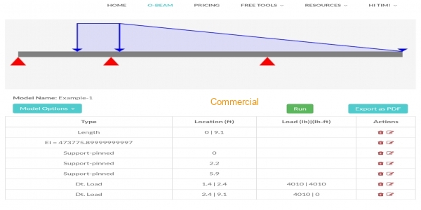 You can specify unlimited support types and loading conditions on your beam model. It gives you support reactions, shear force, bending moment, deflection, and stress diagrams. The free option analyzes statically indeterminate beam models with limitations.