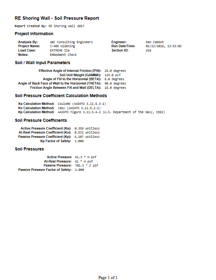- Dynamic Graphic displays key wall parameters, section properties, supports and pressure data entered