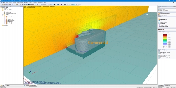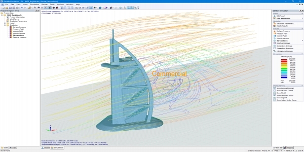 RWIND Simulation is a stand-alone program for numerical simulations of wind flows (digital wind tunnel) around buildings or any other objects by means of CFD simulation (Computational fluid dynamics). The wind simulation can be performed for simple or complex structures. The generated wind loads acting on these objects can be imported to the structural analysis and design software RFEM and RSTAB.