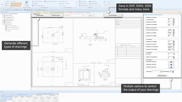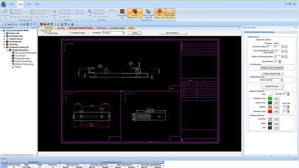 You can generate detailed drawings that include plan, elevation, and sectional views with rebar marks. Schedule drawing gives a summary table for design results. GA drawings include all the footings designed in the project to scale with grid lines and grid marks that help identify interference.