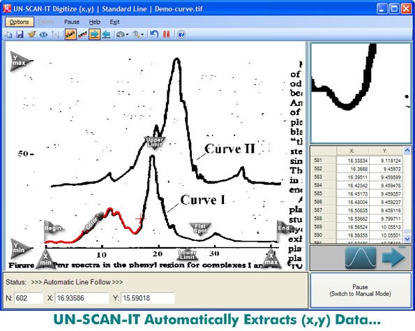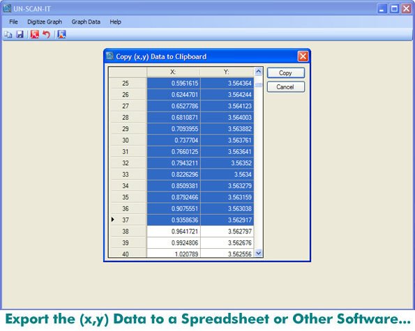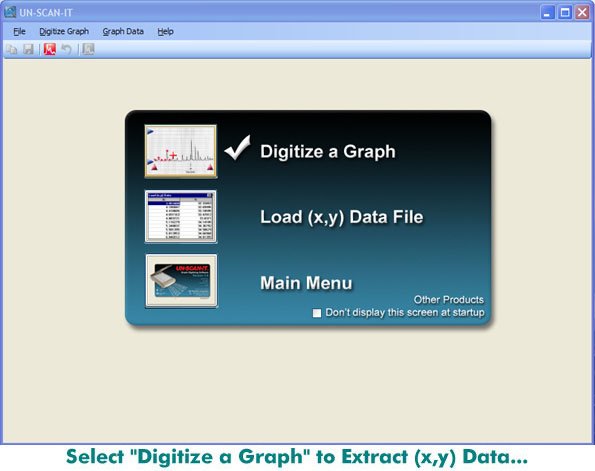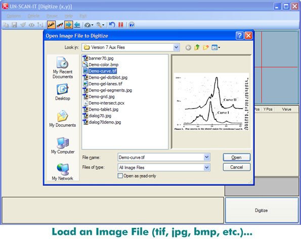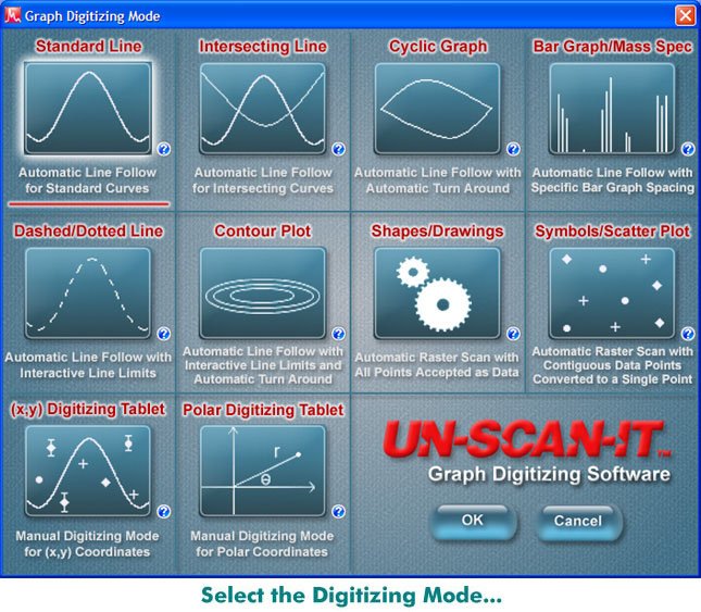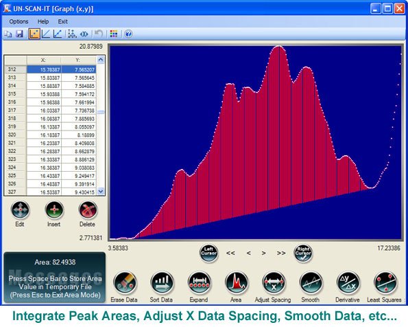 The UN‑SCAN‑IT Graph Digitizer software converts graph images to their underlying (x,y) data automatically. UN‑SCAN‑IT digitizer software works with most image formats (JPG, TIFF, GIF, BMP, PNG, etc.) from any scanner, digital camera, or other image source to digitize plots, strip charts, instrumental output, old graphs, published graphs, etc. In addition to the many graph digitizing features, UN‑SCAN‑IT also integrates peak areas, smoothes data, takes derivatives, re‑scales graphs, and exports the (x,y) data for use in other programs.